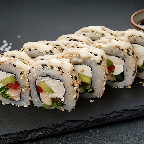 Сыр сливочный, цыпленок, авокадо, болгарский перец, чука, кунжут, рис, нори, ореховый соус