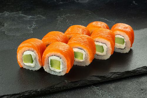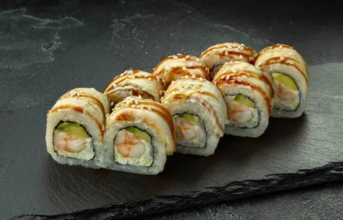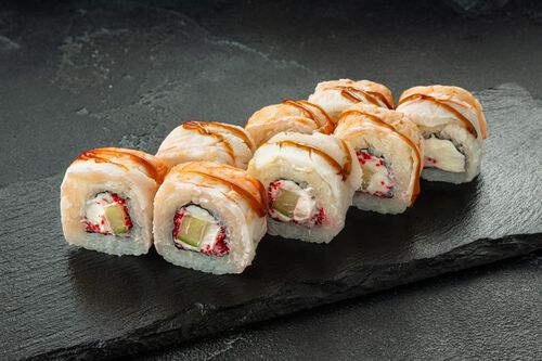 Сыр сливочный, креветка тигровая, огурец, масаго красная, рис для суши, нори, унаги-соус