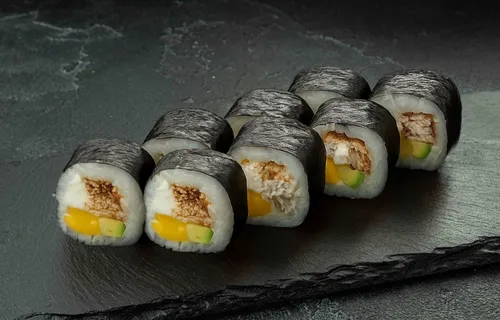 Сыр сливочный, угорь, авокадо, манго свежее, рис для суши, нори