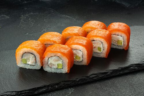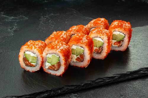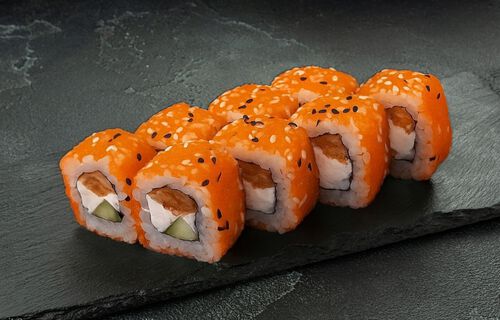 Сливочный сыр, крабовый крем, лосось терияки, масаго оранжевая огурец, кунжут, рис, нори