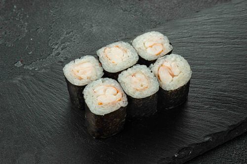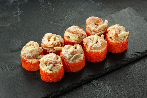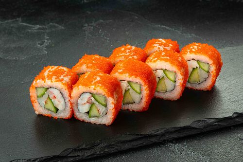 Креветка тигровая, крабовый крем, огурец, масаго оранжевая, рис для суши, нори