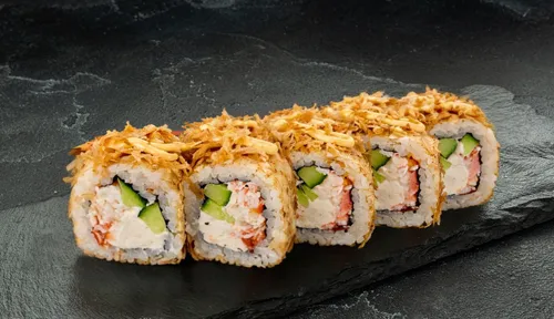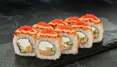 Сыр сливочный, крабовый крем, огурец, помидор, стружка тунца, лук фри, рис для суши, нори, спайси-соус
