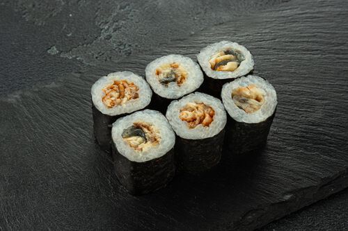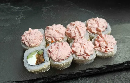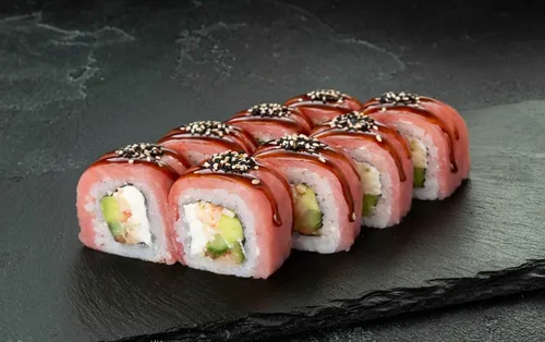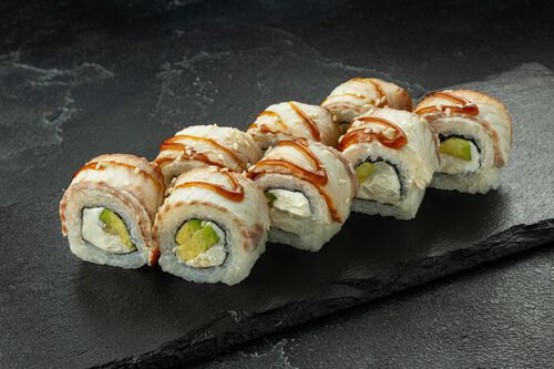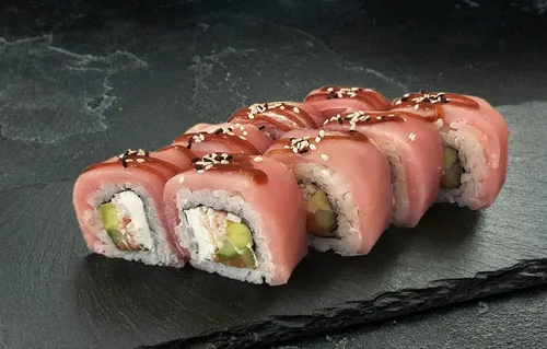 Сыр сливочный, тунец, крабовый крем, угорь, авокадо, огурец, кунжут, рис, нори, унаги-соус
