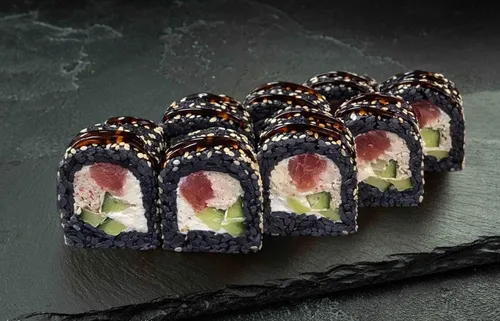 Сыр сливочный, тунец, крабовый крем, огурец, чернила каракатицы, кунжут, рис, нори, унаги-соус