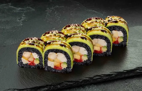 Сыр сливочный, гребешок, авокадо, манго, огурец масаго красная, чернила каракатицы, кунжут, рис, нори, унаги-соус