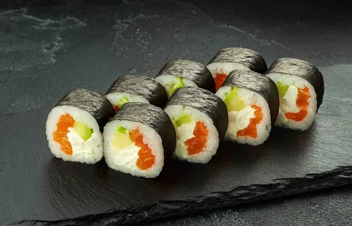 Сыр сливочный, лосось, креветки тигровые, огурец, рис для суши, нори