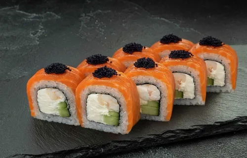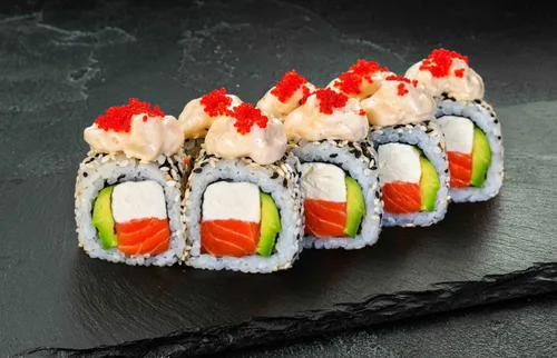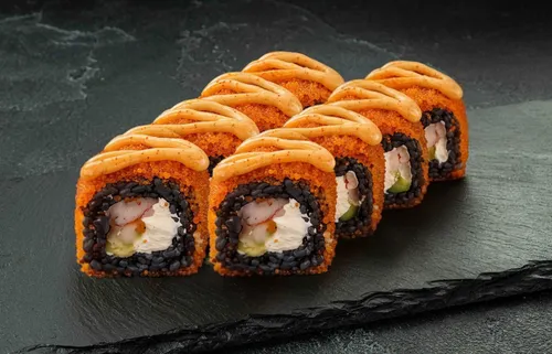 Сыр сливочный, креветка тигровая, авокадо, масаго оранжевая, чернила каракатицы, рис, нори, спайси-соус