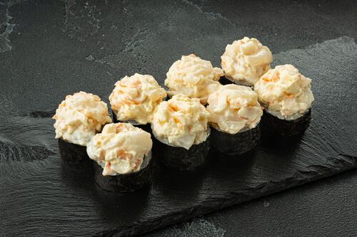Сыр сливочный, гребешок, креветка тигровая, огурец, рис для суши, нори, спайси-соус