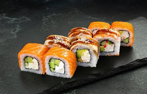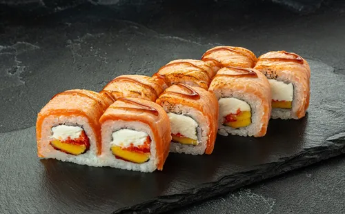 Сыр сливочный, лосось, манго свежее, масаго оранжевая, рис для суши, нори, унаги-соус