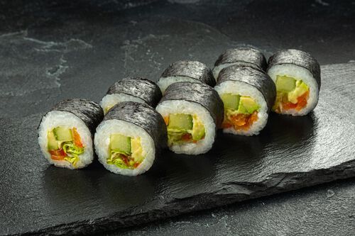 Авокадо, салат айсберг, перц болгарский, огурец, рис для суши, нори, соус сладкий чили