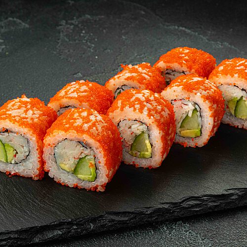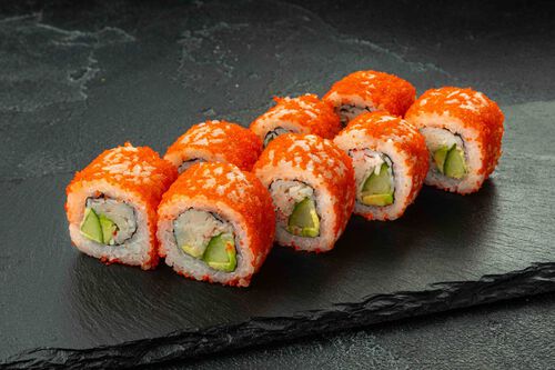 Крабовый крем, авокадо, огурец, масаго оранжевая, рис для суши, нори
