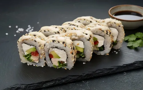 Сыр сливочный, цыпленок, авокадо, болгарский перец, чука, кунжут, рис, нори, ореховый соус