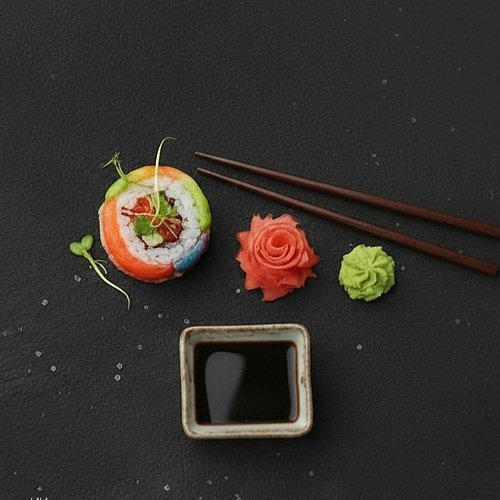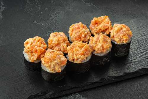 Сыр сливочный, лосось, тунец, огурец, рис для суши, нори, спайси-соус